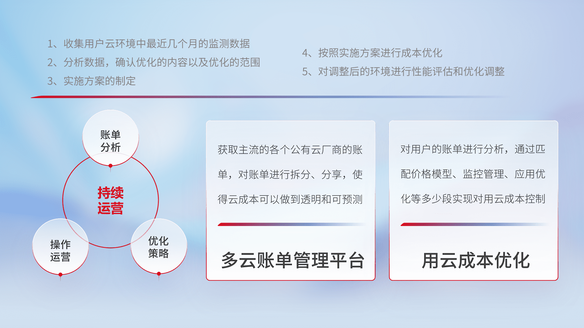 通过多云纳管,,,,以统一的资源数据模型把客户的云资源进行抽象和封装,,,,进而实现对多云资源的统一操作,,保障云资源管理的可靠性、、稳定性与可用性。。量身定制化运维内容,,,,配置、、开发运维、、补丁管理、、、、备份、、、监控、、、认证和访问管理、、、审计和日常巡检等,,,保障在用云过程中的可靠度,,,,稳定度以及高可用率。。。